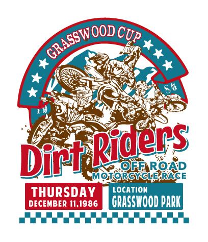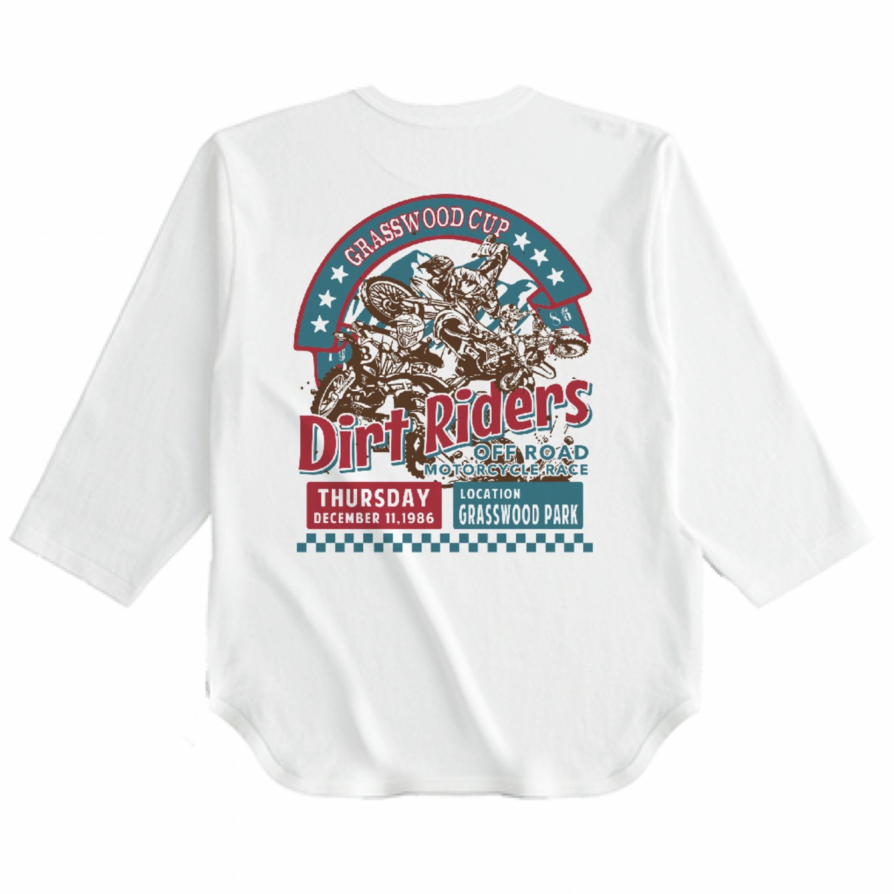1986年12月11日開催の架空のオフロードバイクレース「Dirt Riders」を記念したベースボールTシャツ。