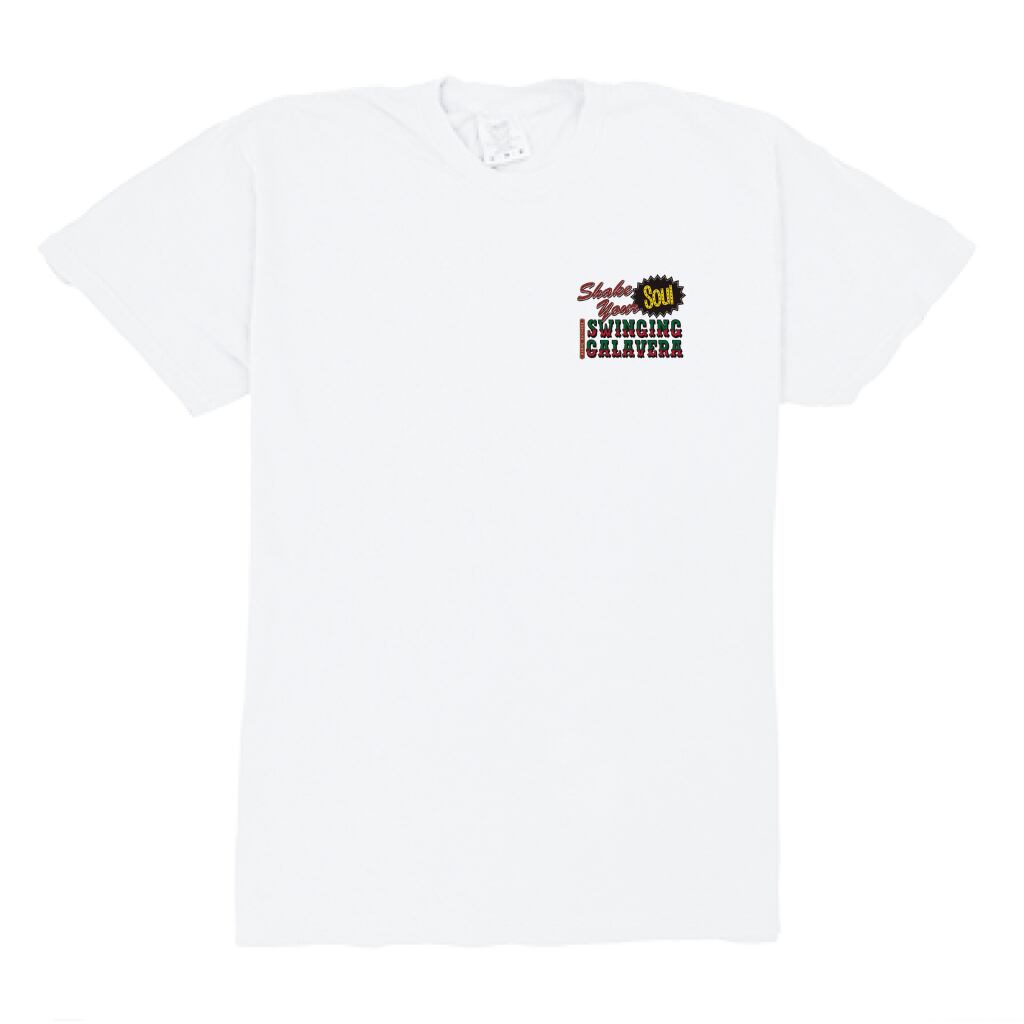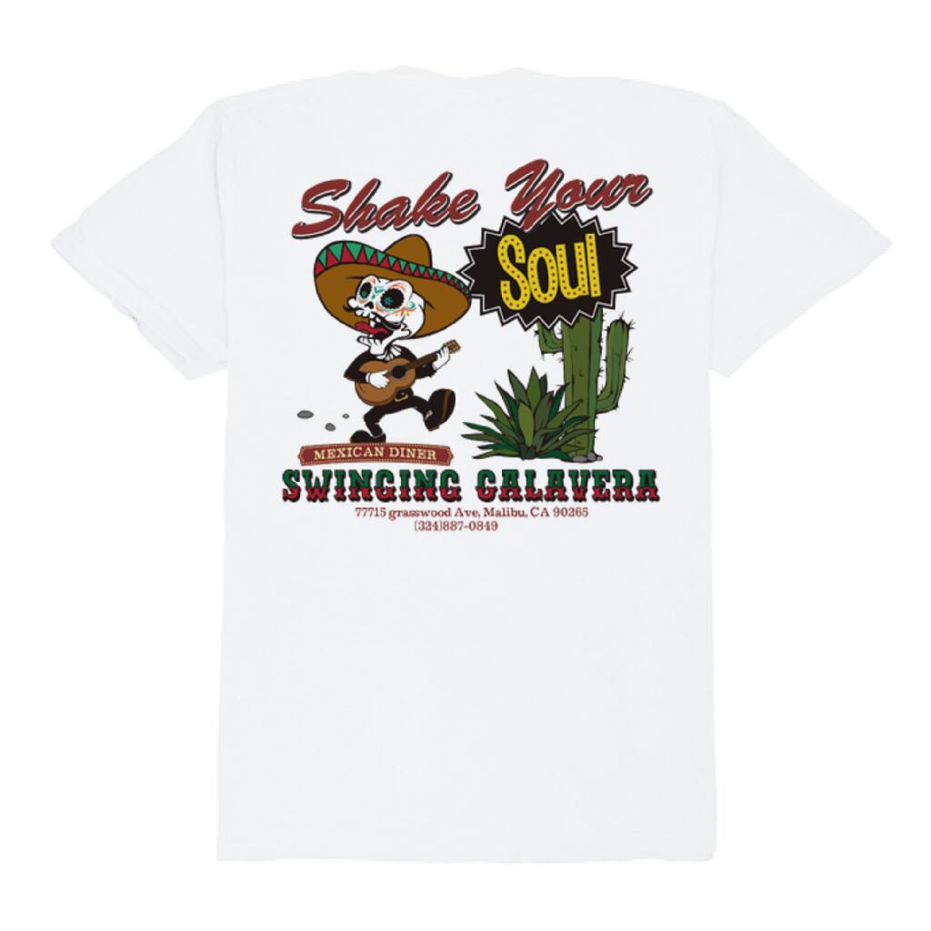 アメリカ ロサンジェルスのビーチエリアの街「マリブ」にあるGRASSWOOD Avenueに面した架空のメキシカンダイナー「SWINGING CALAVERA」のスーベニアTシャツをイメージしたデザイン。